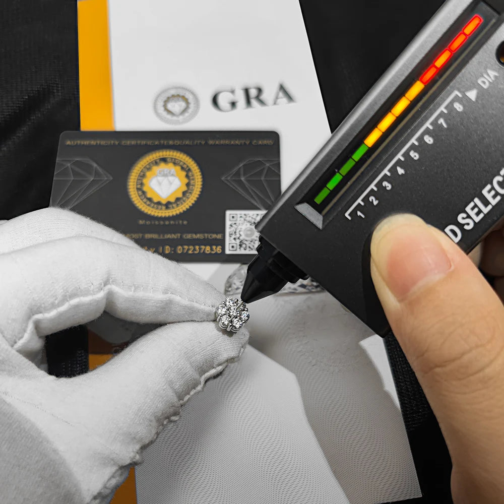 Elevate your jewelry collection with these stunning moissanite cluster flower studs, expertly crafted in 925 sterling silver. Each pair features premium VVS moissanite stones that deliver exceptional brilliance and fire, perfect for making a bold statement or adding understated elegance to everyday wear. The versatile round design works seamlessly across casual and formal settings, while the lightweight construction ensures all-day comfort. GRA certified for authenticity and quality, these hip hop-inspired earrings combine timeless sophistication with contemporary flair. Available in 8mm and 12mm sizes to suit your personal style. Durable, radiant, and undeniably eye-catching.